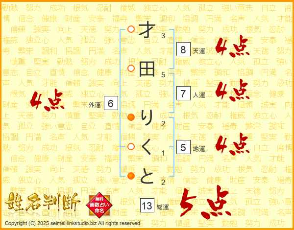 生活面を象徴する運勢です。外部から受ける影響力を表し、結婚運、家庭運や職場、環境への順応性を表します。総運から人運を引いた画数。姓や名が1文字の場合を除く。