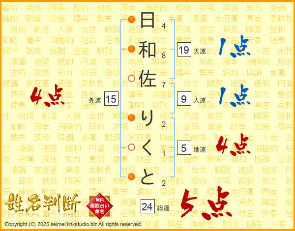 日(4画)和(8画)佐(7画) り(2画)く(1画)と(2画)