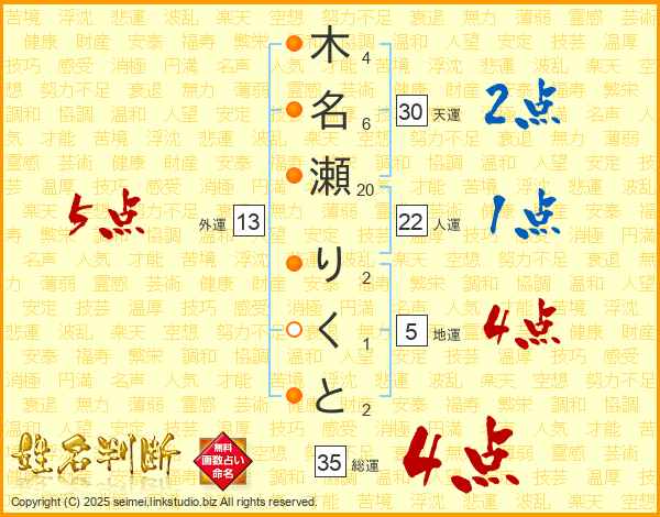 木(4画)名(6画)瀬(20画) り(2画)く(1画)と(2画)