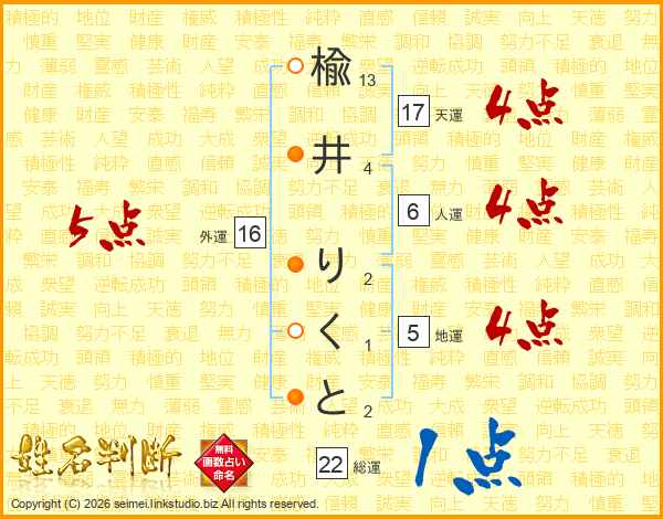楡井りくとさんの外運は16画の5点!