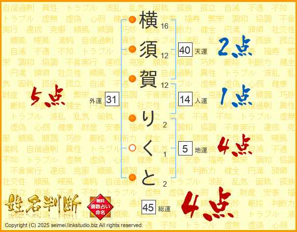 生活面を象徴する運勢です。外部から受ける影響力を表し、結婚運、家庭運や職場、環境への順応性を表します。総運から人運を引いた画数。姓や名が1文字の場合を除く。