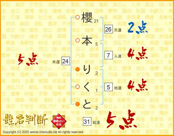 櫻(21画)本(5画) り(2画)く(1画)と(2画)