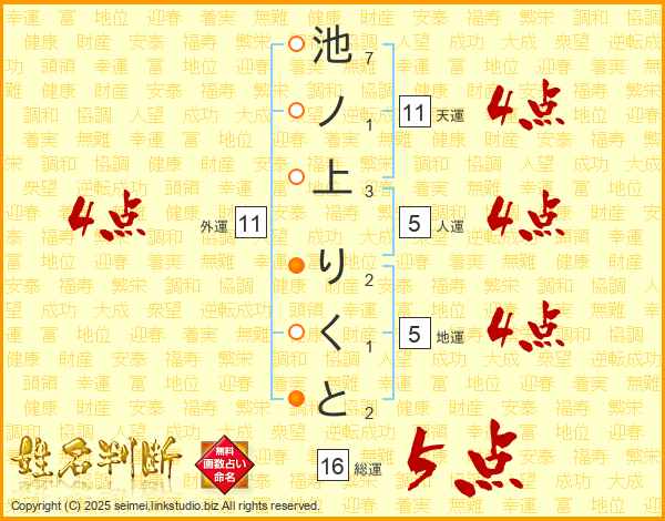 生活面を象徴する運勢です。外部から受ける影響力を表し、結婚運、家庭運や職場、環境への順応性を表します。総運から人運を引いた画数。姓や名が1文字の場合を除く。