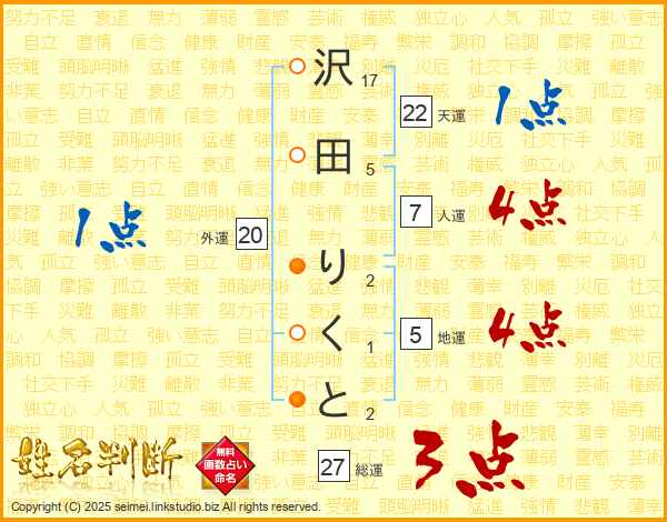 生活面を象徴する運勢です。外部から受ける影響力を表し、結婚運、家庭運や職場、環境への順応性を表します。総運から人運を引いた画数。姓や名が1文字の場合を除く。