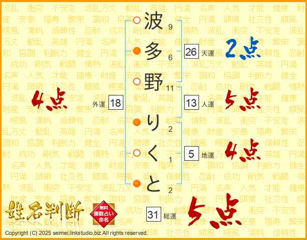 生活面を象徴する運勢です。外部から受ける影響力を表し、結婚運、家庭運や職場、環境への順応性を表します。総運から人運を引いた画数。姓や名が1文字の場合を除く。