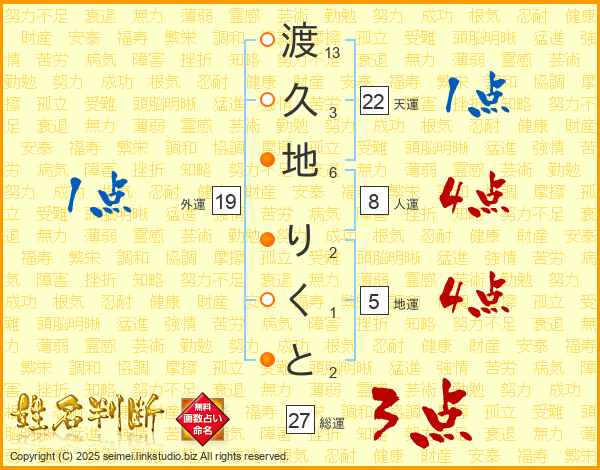 渡(13画)久(3画)地(6画) り(2画)く(1画)と(2画)