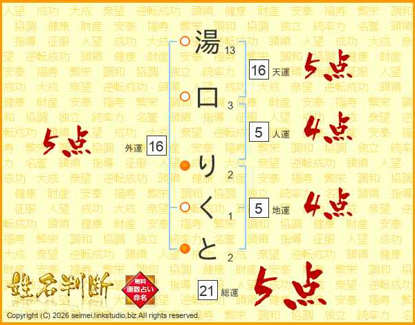 湯口りくとさんの総運は21画の5点!
