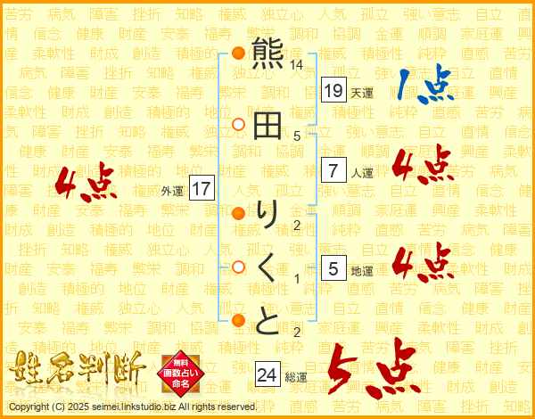 生活面を象徴する運勢です。外部から受ける影響力を表し、結婚運、家庭運や職場、環境への順応性を表します。総運から人運を引いた画数。姓や名が1文字の場合を除く。