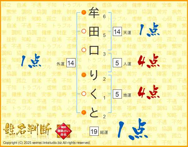 生活面を象徴する運勢です。外部から受ける影響力を表し、結婚運、家庭運や職場、環境への順応性を表します。総運から人運を引いた画数。姓や名が1文字の場合を除く。