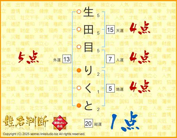 生(5画)田(5画)目(5画) り(2画)く(1画)と(2画)