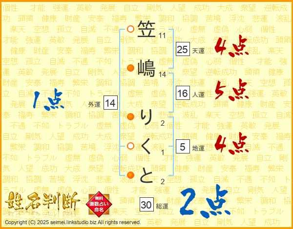 笠(11画)嶋(14画) り(2画)く(1画)と(2画)