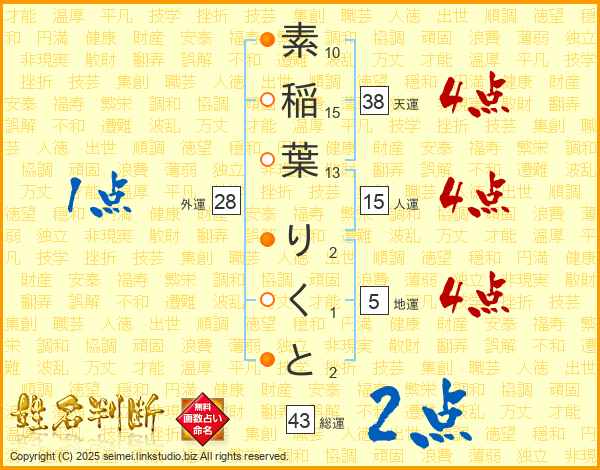 素(10画)稲(15画)葉(13画) り(2画)く(1画)と(2画)
