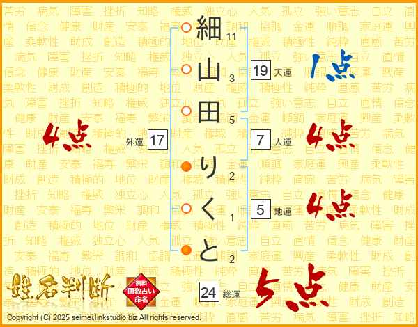 細(11画)山(3画)田(5画) り(2画)く(1画)と(2画)