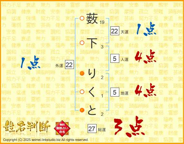 生活面を象徴する運勢です。外部から受ける影響力を表し、結婚運、家庭運や職場、環境への順応性を表します。総運から人運を引いた画数。姓や名が1文字の場合を除く。