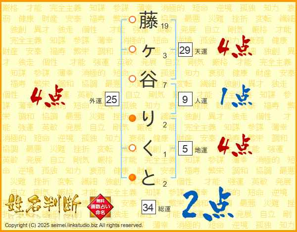 藤(19画)ヶ(3画)谷(7画) り(2画)く(1画)と(2画)