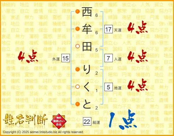 生活面を象徴する運勢です。外部から受ける影響力を表し、結婚運、家庭運や職場、環境への順応性を表します。総運から人運を引いた画数。姓や名が1文字の場合を除く。
