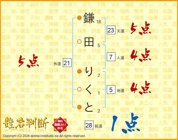 鎌田りくとさんの天運は23画の5点!