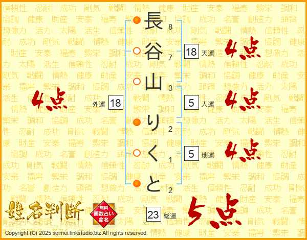 あなたの人生を表す1番重要な運勢です。生涯を通じて影響する総合運となり、主に50歳以降の晩年期に影響を及ぼします。苗字と名前の合計画数。