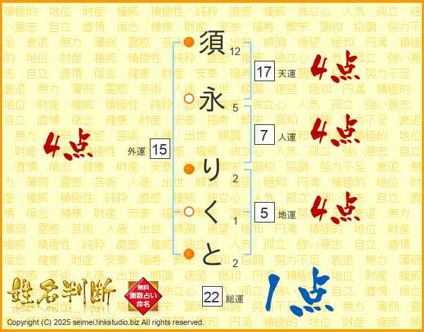 生活面を象徴する運勢です。外部から受ける影響力を表し、結婚運、家庭運や職場、環境への順応性を表します。総運から人運を引いた画数。姓や名が1文字の場合を除く。