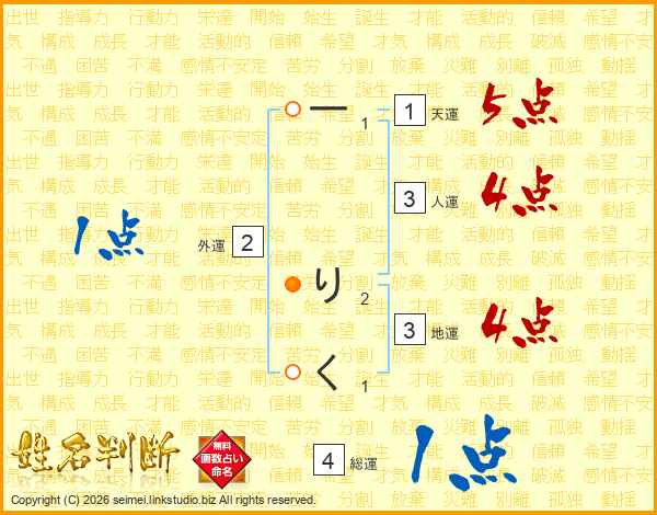 生活面を象徴する運勢です。外部から受ける影響力を表し、結婚運、家庭運や職場、環境への順応性を表します。総運から人運を引いた画数。姓や名が1文字の場合を除く。