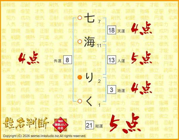 生活面を象徴する運勢です。外部から受ける影響力を表し、結婚運、家庭運や職場、環境への順応性を表します。総運から人運を引いた画数。姓や名が1文字の場合を除く。