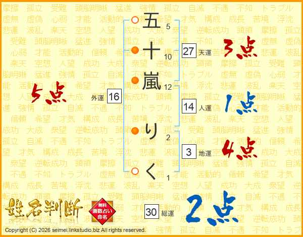 五(5画)十(10画)嵐(12画) り(2画)く(1画)