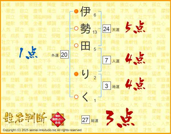 伊(6画)勢(13画)田(5画) り(2画)く(1画)
