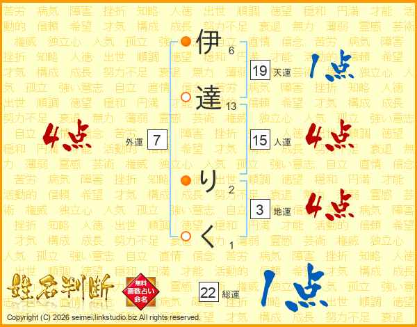 あなたの人生を表す1番重要な運勢です。生涯を通じて影響する総合運となり、主に50歳以降の晩年期に影響を及ぼします。苗字と名前の合計画数。