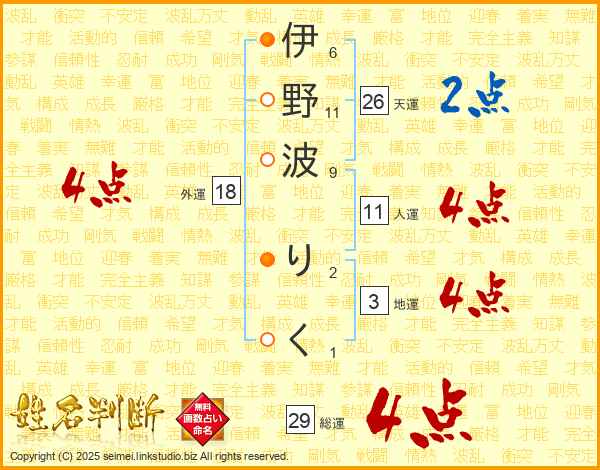 伊(6画)野(11画)波(9画) り(2画)く(1画)