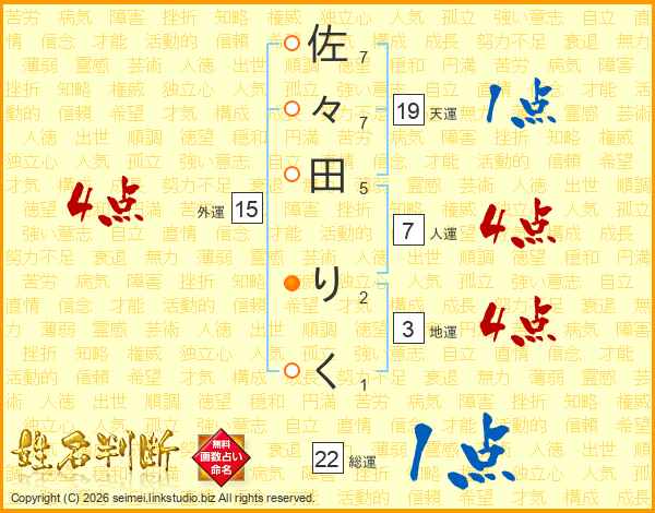 生活面を象徴する運勢です。外部から受ける影響力を表し、結婚運、家庭運や職場、環境への順応性を表します。総運から人運を引いた画数。姓や名が1文字の場合を除く。