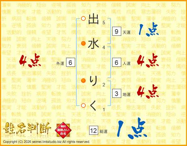生活面を象徴する運勢です。外部から受ける影響力を表し、結婚運、家庭運や職場、環境への順応性を表します。総運から人運を引いた画数。姓や名が1文字の場合を除く。