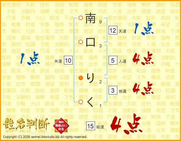 生活面を象徴する運勢です。外部から受ける影響力を表し、結婚運、家庭運や職場、環境への順応性を表します。総運から人運を引いた画数。姓や名が1文字の場合を除く。