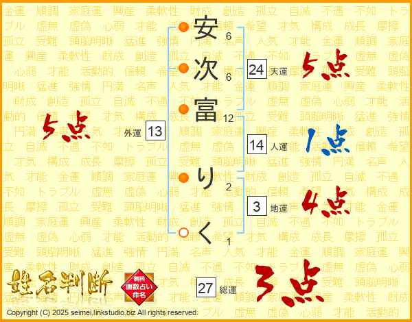 安(6画)次(6画)富(12画) り(2画)く(1画)