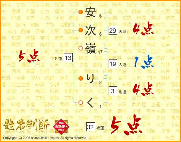 安(6画)次(6画)嶺(17画) り(2画)く(1画)
