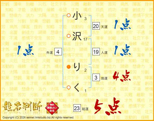 生活面を象徴する運勢です。外部から受ける影響力を表し、結婚運、家庭運や職場、環境への順応性を表します。総運から人運を引いた画数。姓や名が1文字の場合を除く。