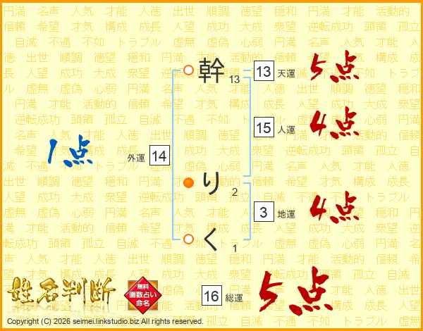 生活面を象徴する運勢です。外部から受ける影響力を表し、結婚運、家庭運や職場、環境への順応性を表します。総運から人運を引いた画数。姓や名が1文字の場合を除く。