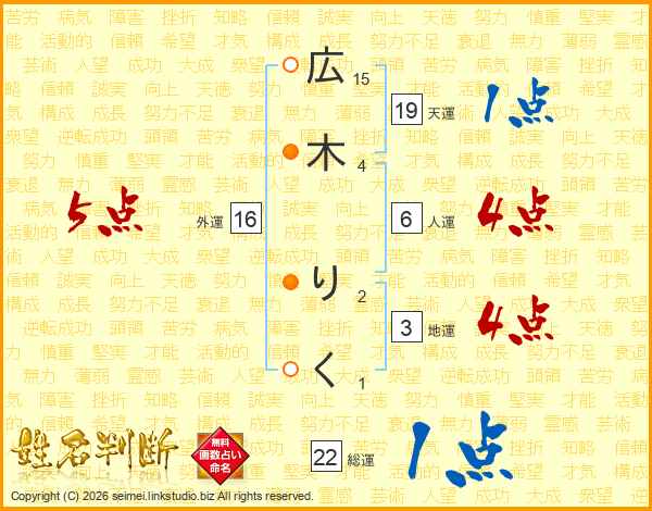 あなたの人生を表す1番重要な運勢です。生涯を通じて影響する総合運となり、主に50歳以降の晩年期に影響を及ぼします。苗字と名前の合計画数。