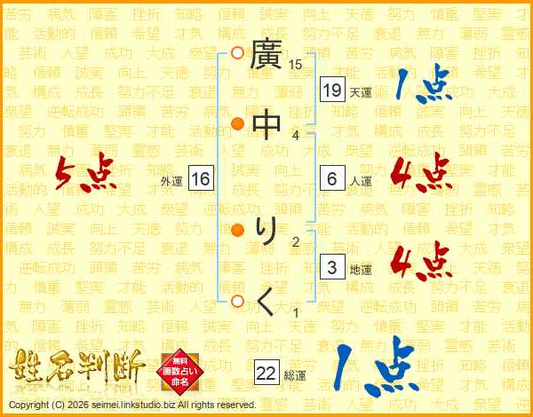 生活面を象徴する運勢です。外部から受ける影響力を表し、結婚運、家庭運や職場、環境への順応性を表します。総運から人運を引いた画数。姓や名が1文字の場合を除く。