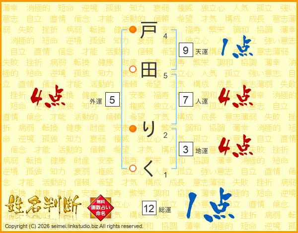 生活面を象徴する運勢です。外部から受ける影響力を表し、結婚運、家庭運や職場、環境への順応性を表します。総運から人運を引いた画数。姓や名が1文字の場合を除く。