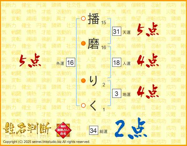 生活面を象徴する運勢です。外部から受ける影響力を表し、結婚運、家庭運や職場、環境への順応性を表します。総運から人運を引いた画数。姓や名が1文字の場合を除く。