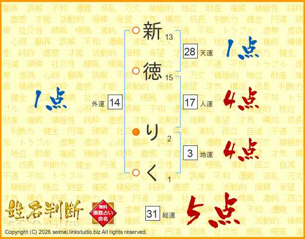 生活面を象徴する運勢です。外部から受ける影響力を表し、結婚運、家庭運や職場、環境への順応性を表します。総運から人運を引いた画数。姓や名が1文字の場合を除く。