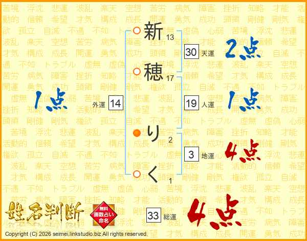 生活面を象徴する運勢です。外部から受ける影響力を表し、結婚運、家庭運や職場、環境への順応性を表します。総運から人運を引いた画数。姓や名が1文字の場合を除く。