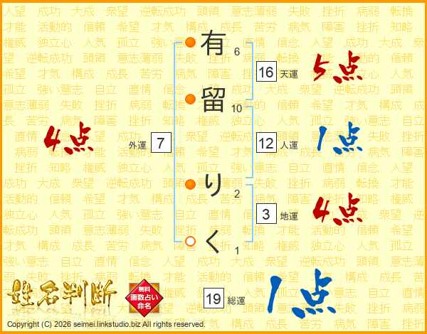 生活面を象徴する運勢です。外部から受ける影響力を表し、結婚運、家庭運や職場、環境への順応性を表します。総運から人運を引いた画数。姓や名が1文字の場合を除く。