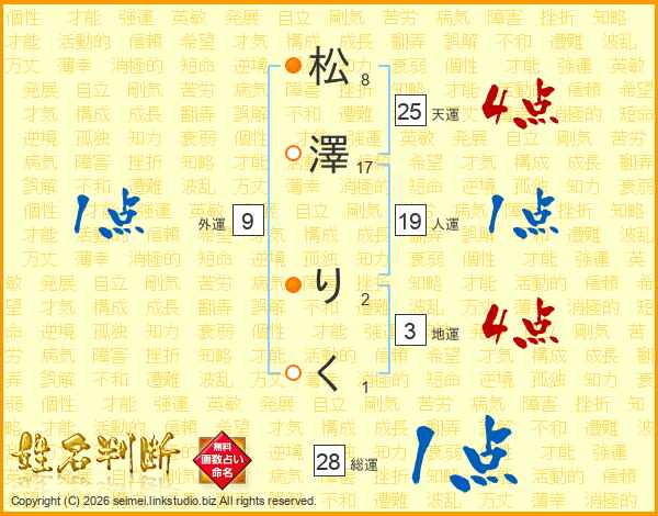 生活面を象徴する運勢です。外部から受ける影響力を表し、結婚運、家庭運や職場、環境への順応性を表します。総運から人運を引いた画数。姓や名が1文字の場合を除く。