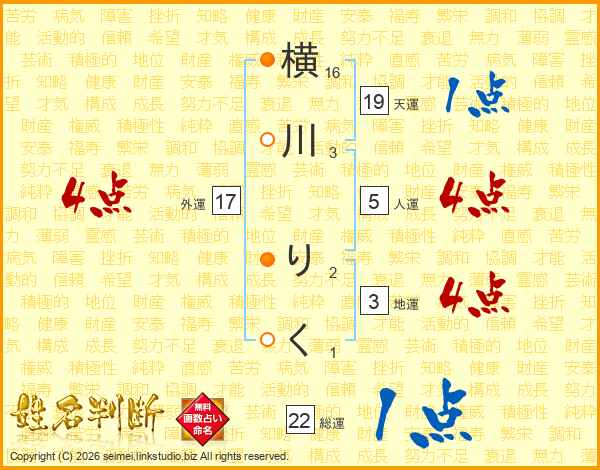 生活面を象徴する運勢です。外部から受ける影響力を表し、結婚運、家庭運や職場、環境への順応性を表します。総運から人運を引いた画数。姓や名が1文字の場合を除く。