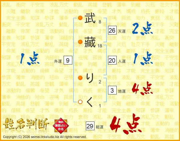 生活面を象徴する運勢です。外部から受ける影響力を表し、結婚運、家庭運や職場、環境への順応性を表します。総運から人運を引いた画数。姓や名が1文字の場合を除く。