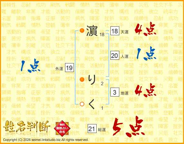 生活面を象徴する運勢です。外部から受ける影響力を表し、結婚運、家庭運や職場、環境への順応性を表します。総運から人運を引いた画数。姓や名が1文字の場合を除く。