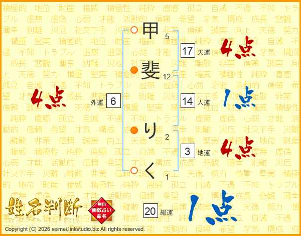 生活面を象徴する運勢です。外部から受ける影響力を表し、結婚運、家庭運や職場、環境への順応性を表します。総運から人運を引いた画数。姓や名が1文字の場合を除く。