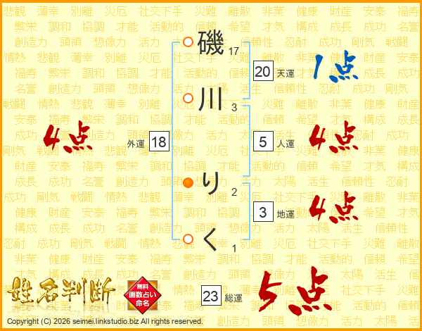 生活面を象徴する運勢です。外部から受ける影響力を表し、結婚運、家庭運や職場、環境への順応性を表します。総運から人運を引いた画数。姓や名が1文字の場合を除く。