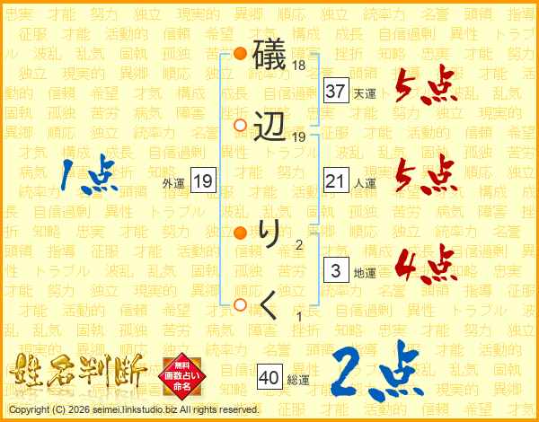 礒辺りくさんの総運は40画の2点!